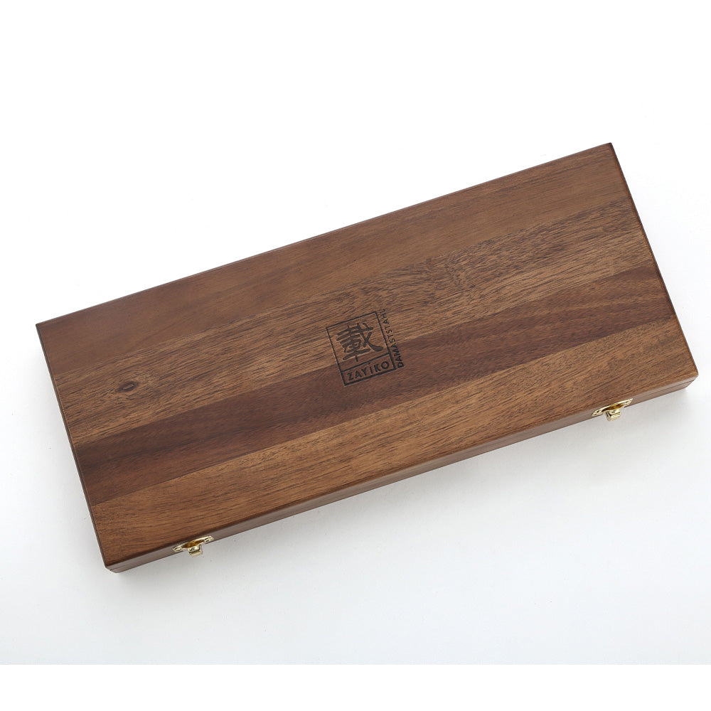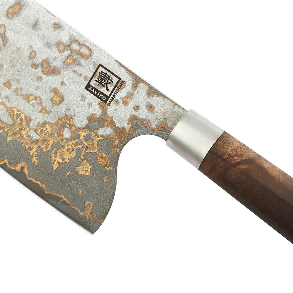 Die Klinge jedes Zayiko -Messers besteht aus mehrfach gewickeltem und gefaltetem Damaststahl mit einer Härte von 60±2 HRC. Dieses Verfahren verleiht den Messern ihre unverwechselbare Struktur, die jedes Stück einzigartig macht. Die feine Maserung des Stahls entsteht durch unterschiedlich angeordnete, gefaltete Stahllagen, die für außergewöhnliche Schärfe und Langlebigkeit sorgen.