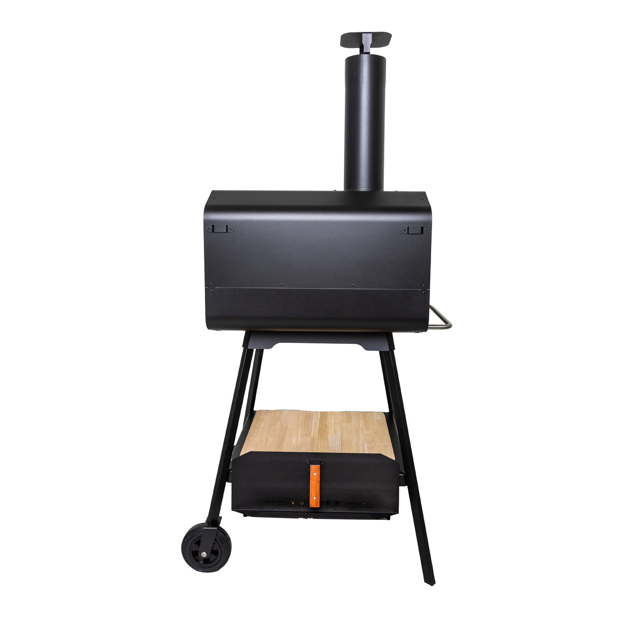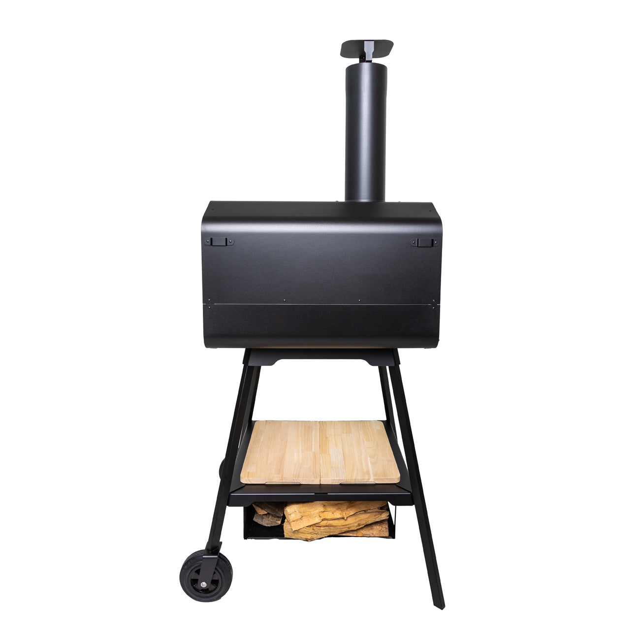 - Materialien: Pulverbeschichteter Edelstahl außen, Chamotte & Keramikwolle innen, edler Hartholzgriff, hitzebeständiges Glasfenster.