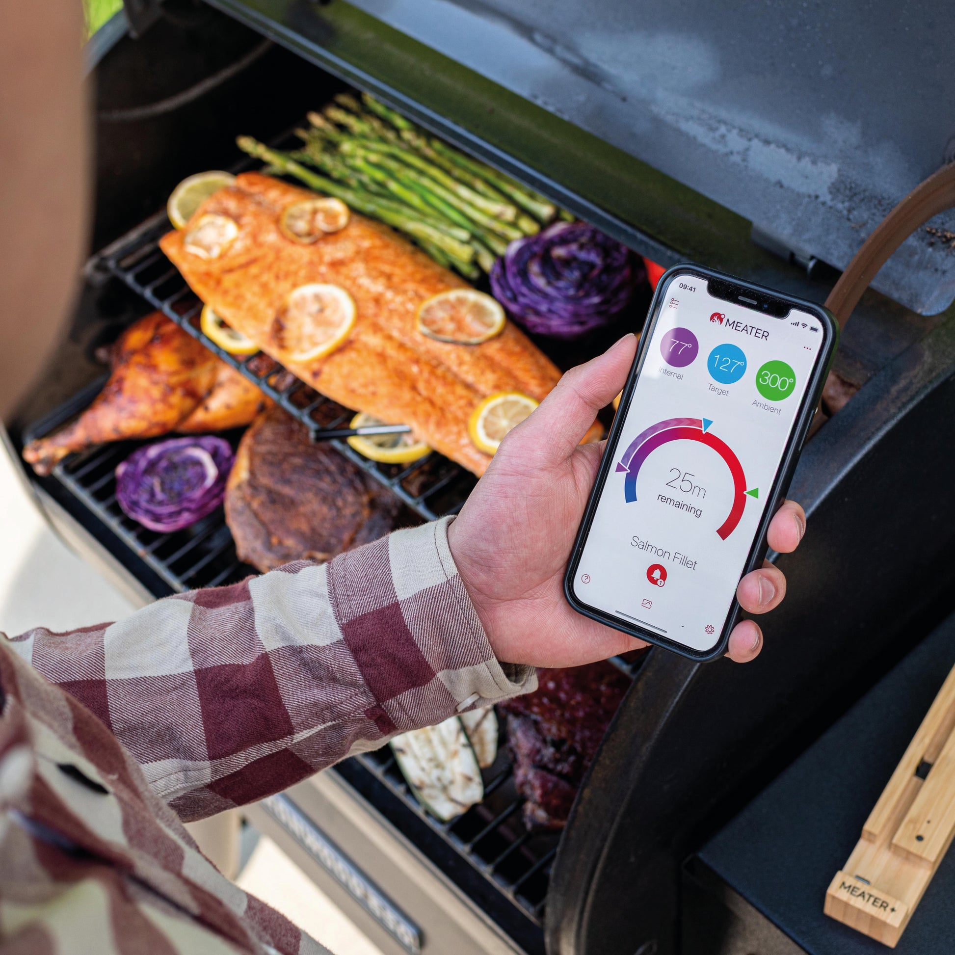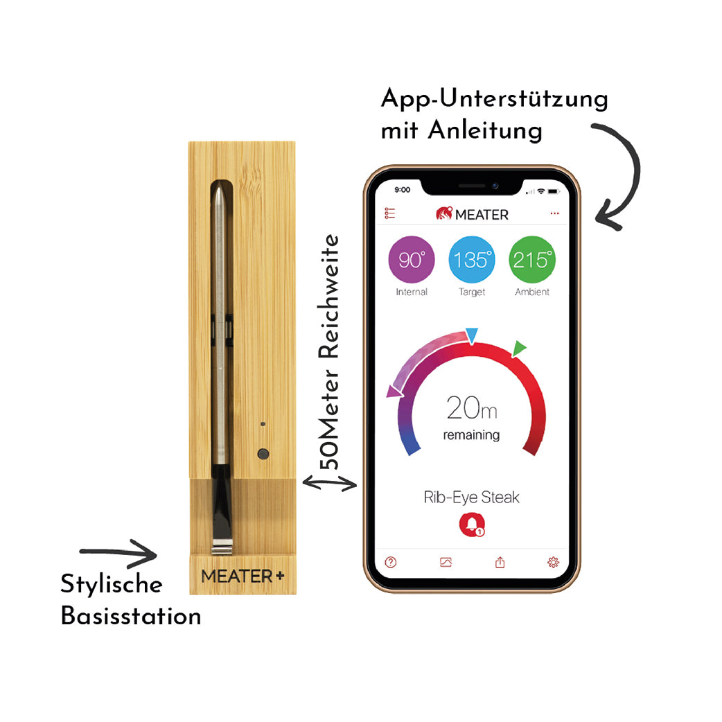 Diese Kombination sorgt dafür, dass du nicht nur das Fleisch, sondern auch die gesamte Garumgebung im Blick hast. Die MEATER App berechnet daraus automatisch die Garzeit und gibt dir eine präzise Prognose, wann dein Essen perfekt fertig ist.