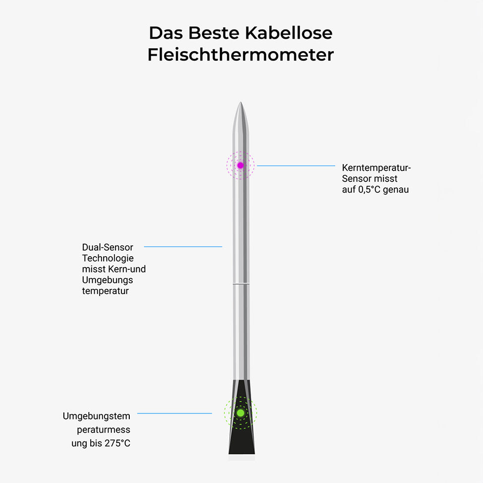 - Dual-Sensor-Technologie: Misst gleichzeitig die Kerntemperatur im Fleisch (bis 100 °C) und die Umgebungstemperatur (bis 275 °C).