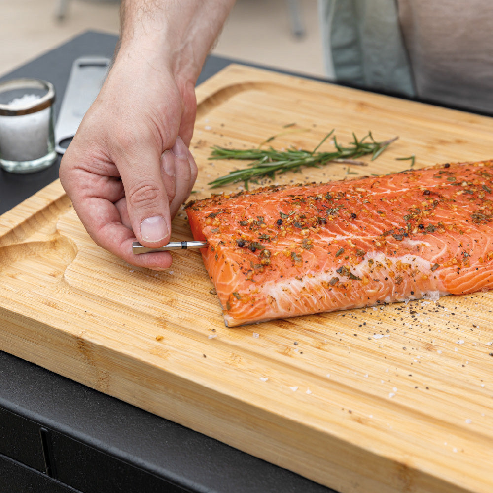 Der smarte Temperaturfühler misst gleichzeitig die Kerntemperatur und die Umgebungstemperatur im Grill. Per App bekommst du alle Daten direkt aufs Handy, inklusive Garzeit-Berechnung und Alarmfunktion.