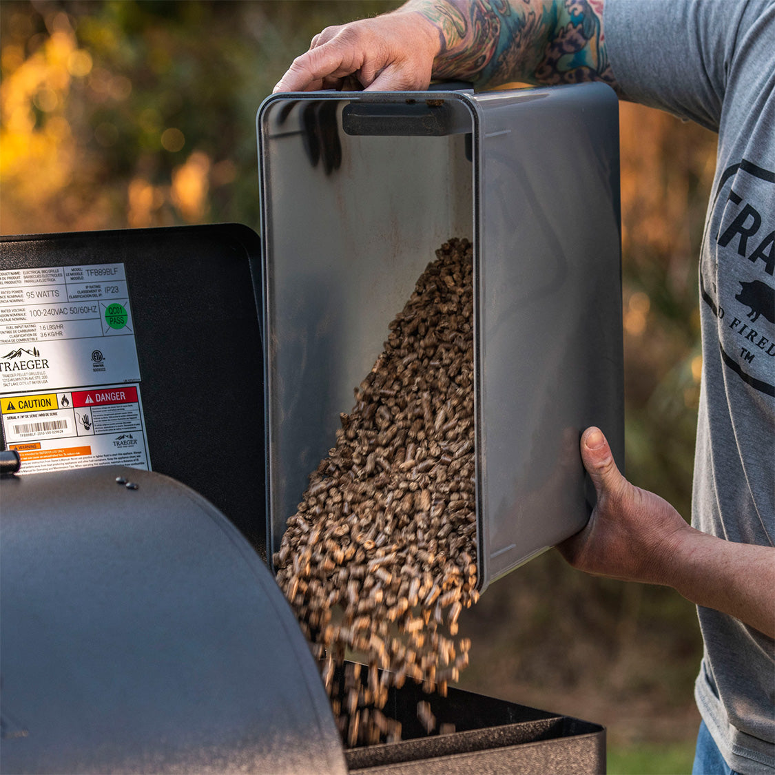 Traeger verwendet 100 % natürliche, in den USA hergestellte Hartholzpellets. Diese sorgen für eine konstante Verbrennung und das charakteristische Holzfeuer-Aroma.